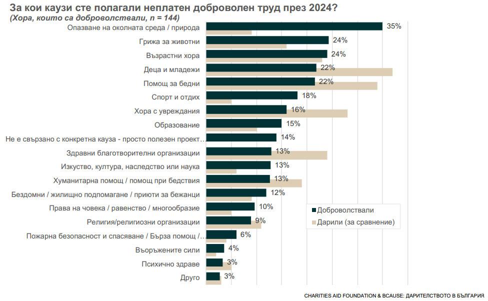Един от всеки четирима (26%) дарява за хуманитарна помощ и подпомагане на пострадали от бедствия, а в Азия хората са най-склонни (16%) да подкрепят екологични каузи.