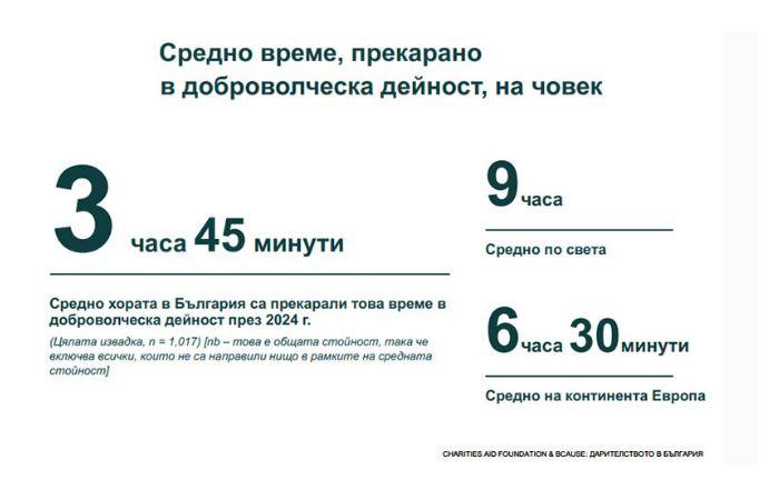 Само 5% от българските граждани даряват 12 или повече пъти годишно. За сравнение, данните в световен мащаб са тройно по-високи. Като време също отделяме малко.