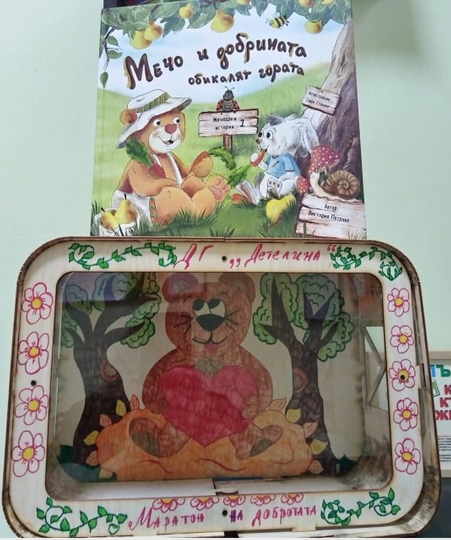 „След като се запознахме с добрините на катеричката, мечо, зайко и пчелите от книжката „Мечо и добрината обикалят гората“, поставихме специално изработена и ръчно нарисувана дървена кутия за добрини, в която нашите деца с помощта на своите родители поставиха своите добрини - красиви детски жестове или послания, вдъхновени от Мечето от книжката „Мечо и добрината обикалят гората“, поясни психолог Цветелина Иванова.