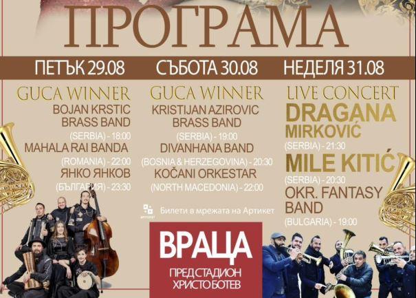 В неделя програмата започва с изпълненията на Оркестър Фентъзи бенд, а кулминацията са концертите на звездите на сръбската музика Драгана Миркович и Миле Китич.