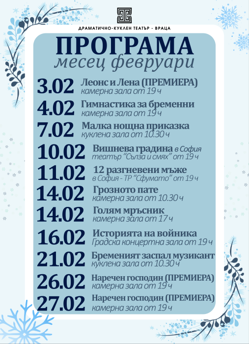 Февруарската програма продължава с разнообразие от заглавия – от съвременна българска драматургия и световна класика до спектакли за най-малките зрители. Публиката ще може да гледа „Гимнастика за бременни“, „Историята на войника“, „Вишнева градина“, „Дванайсет разгневени мъже“, „Отворена брачна двойка“, „Кошмарна комедия“, както и редица детски представления, сред които „Приказоразказвачи“, „Малка нощна приказка“, „Грозното пате“ и „Бременският заспал музикант“, който ще гостува и в редица градове в страната.