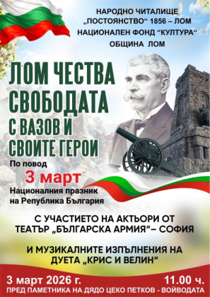 Тази вечер от 17:00 часа в камерната зала на Народно читалище „Постоянство 1856“ в Лом ще бъде открита документалната фотоизложба „Ломчани и Освобождението“. Тя представя чрез писма, снимки и документи подвига на опълченци и революционери от Ломско в Руско-турската освободителна война от 1877-1878 година. Изложбата е посветена на Националния празник на Република България - Трети март, и е част от проекта на читалището „Лом чества Свободата с Вазов и своите герои“.