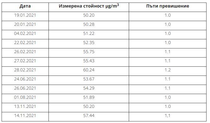 За периода 01.01.2021г. - 31.12.2021г. са регистрирани 12 превишения (9 от тях са регистрирани през отоплителните периоди - 7 през януари-март и 2 през ноември) на средноденонощната норма по показателя ФПЧ10 при нормативно установен допустим брой от 35 превишения годишно.