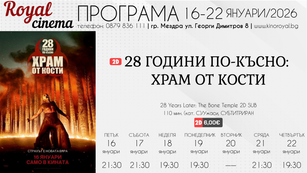 Използвайки част от незабравимите думи на иконичния Артър К. Кларк от легендарното му интервю за BBC през 1964 г., в което той предсказва бъдещето, първият трейлър на 28 години по-късно: Храм от кости ни отвежда право в сърцето на ужаса, рисувайки картина на свиреп свят, в който най-голямата опасност може би не са чудовищата отвъд стените на сигурните ни убежища, а тъмнината, която носим в себе си. Съчетавайки дълбоки философски теми с първична кървава агресия, 28 години по-късно: Храм от кости обещава непредсказуемо филмово изживяване, което ще ускори пулса ни и ще провокира мисълта ни.