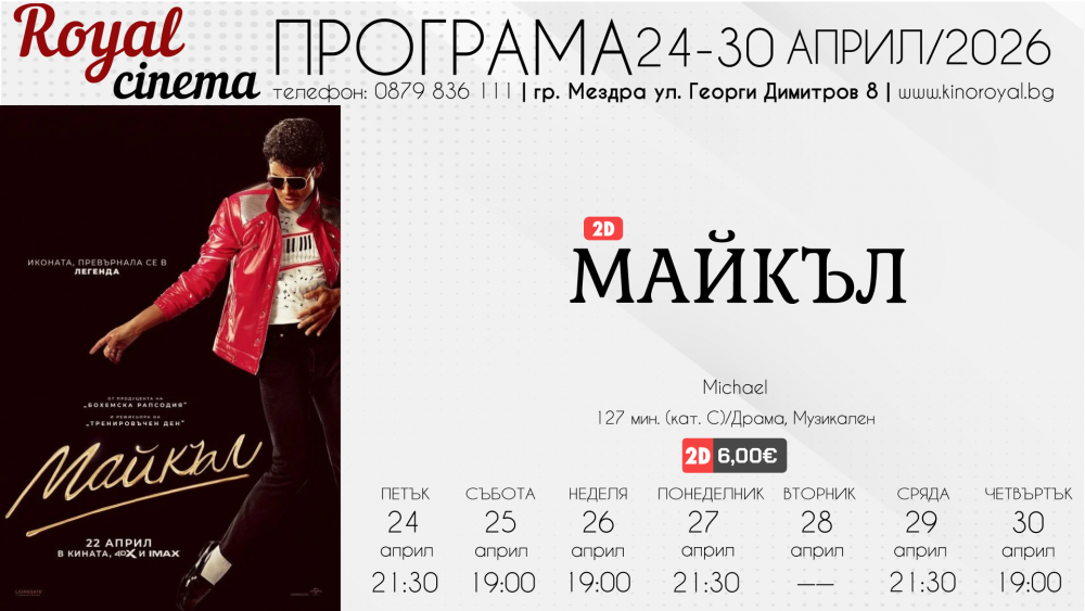 Този април ще имаме шанса да се потопим в живота на един от най-великите и влиятелни артисти на всички времена – Майкъл Джексън. Майкъл отвежда зрителите отвъд музиката, разкривайки човека зад легендата – от ранните му години като част от The Jackson Five до превръщането му в глобален феномен и емблема на поп жанра. Със сцени, които пресъздават както незабравимите му изпълнения, така и личните моменти зад кулисите, Майкъл предлага уникален и дълбоко човешки поглед към Краля на попа.