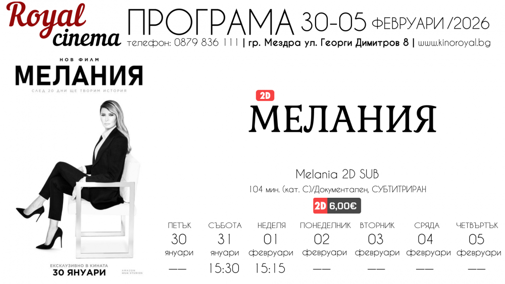 Мелания отвежда зрителите в свят, който рядко достига до публичното пространство – от ключови срещи и лични разговори до моменти на планиране, колебание и пълна концентрация, в които се подготвя преходът към Белия дом и завръщането на семейство Тръмп във Вашингтон. Филмът не заема политическа позиция и не търси интерпретации, а изгражда наблюдателен и въздействащ портрет на самия процес на преход – един от най-внимателно следените и значими моменти в съвременната история – с фокус върху Мелания Тръмп, която балансира между семейство, бизнес и благотворителни ангажименти, докато отново поема ролята на първа дама на Съединените щати.