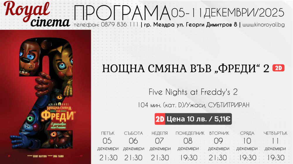 В Нощна смяна във „Фреди“ 2 кошмарът на Майк продължава да се разраства, когато убийствените аниматронни талисмани от пицарията на Фреди се отправят на безжалостно кърваво отмъщение. Този път никой не е защитен. Първият тийзър трейлър на филма само загатва за ужаса, който ни очаква в кината през декември, но дава ясна заявка, че Нощна смяна във „Фреди“ 2 няма да изневерява на атмосферата, стила и аналоговият подход на първия филм, които го превърнаха в световен хит.