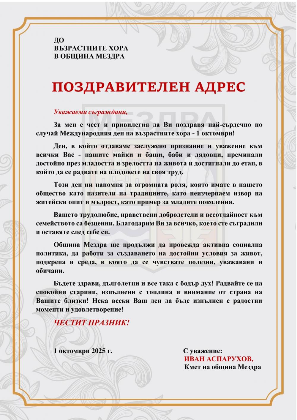 01.10.2025 • Регион / Мездра • 3235 • 0 Кметът на Мездра с поздравителен адрес към възрастните хора от MediaNews.bg Споделете Twitter Facebook Google+