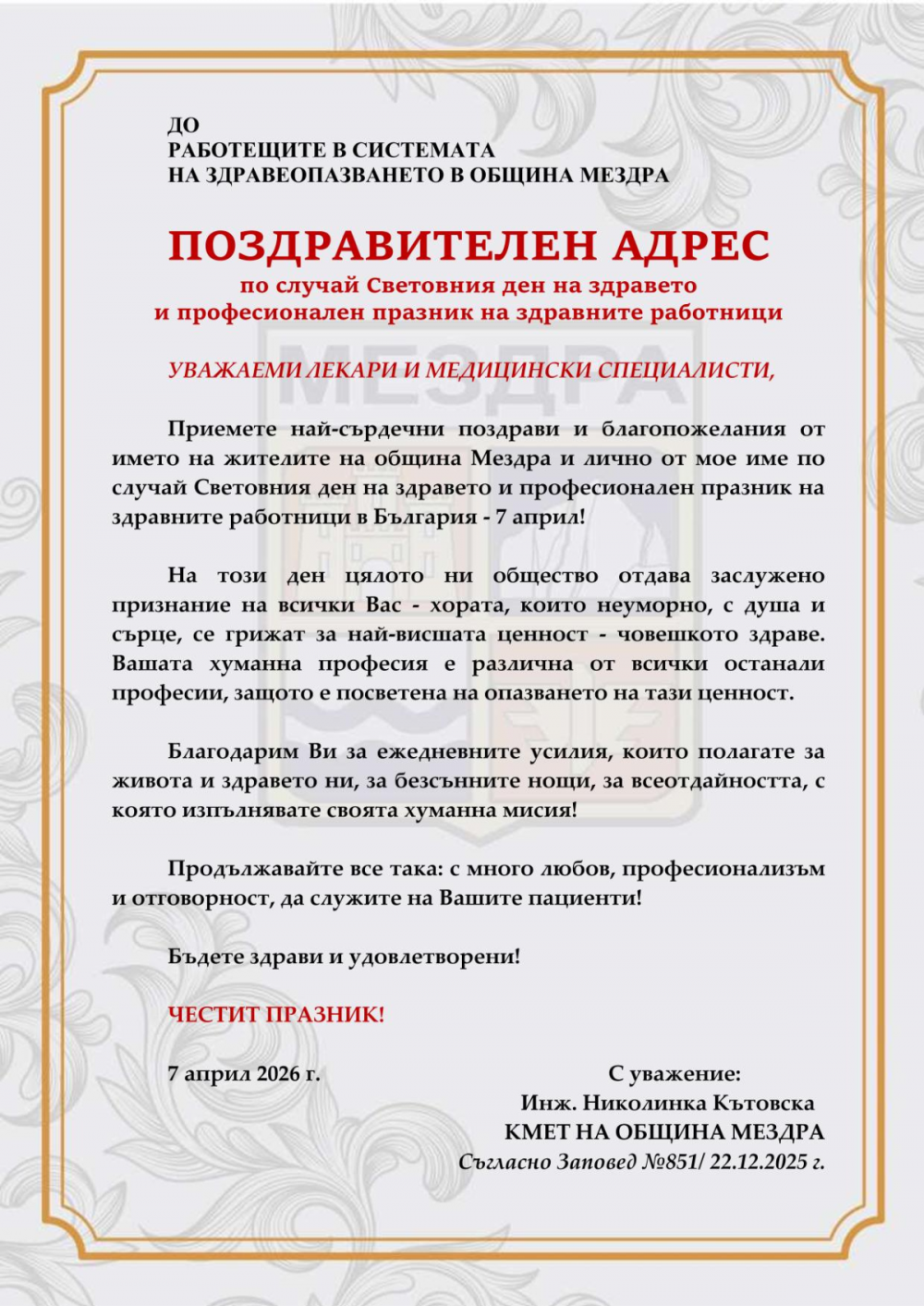 Днес, 11:30 • Здраве • Регион / Мездра • 78 • 0 Кметът на община Мездра с Поздравителен адрес до здравните работници от MediaNews.bg Споделете X Twitter Facebook