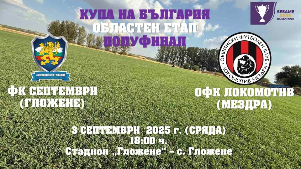 Припомняме, че през миналия сезон в Северозападната Трета лига ОФК Локомотив (Мездра) победи с 3:1 първенеца на „А“ Областна група Враца ФК Септември 98 (Гложене) в полуфинална среща от областния етап на турнира за Купата на България и се класира за следващия кръг на надпреварата.