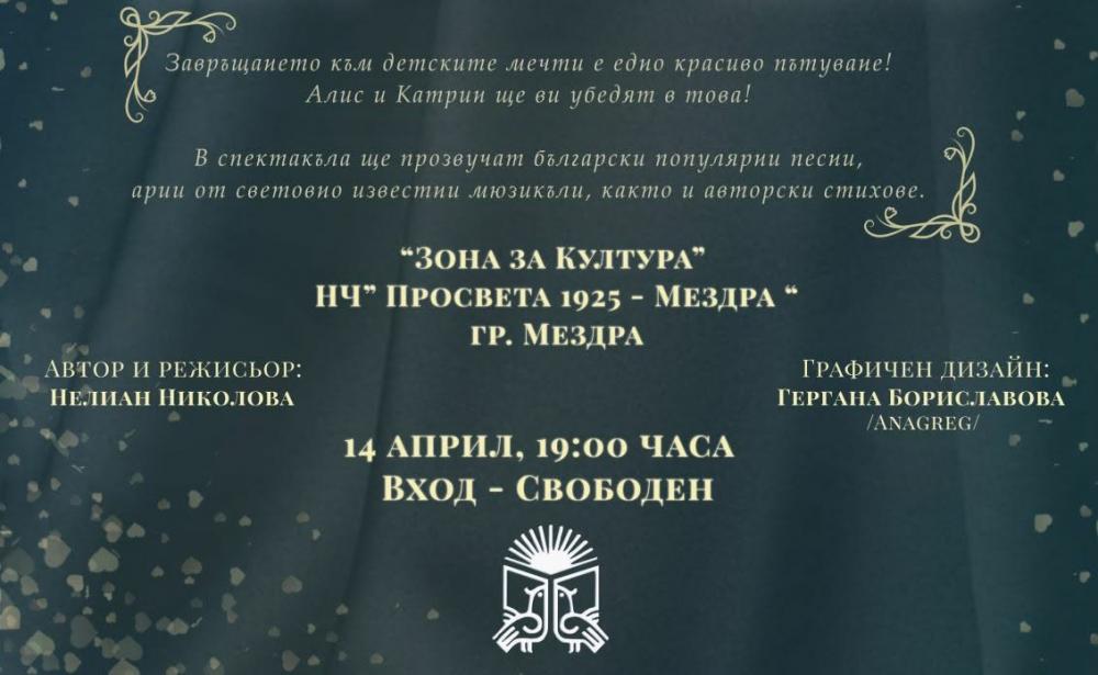 Гледайте музикалния спектакъл „Време за мечти“ на 14 април от 19:00 ч. в „Зона за култура“ пред НЧ „Просвета-1925“ - Мездра.