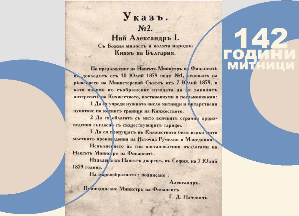 На 7 юли 1879 г. с Указ №2 на княз Александър I Батенберг са учредени митниците и митарствените пунктове на Княжество България. В указа е записано, че основната задача на новосъздадената институция е „за да се запазят интересите на Княжеството”.