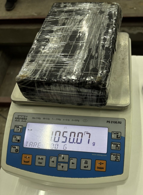 В процеса на инспекцията митническите инспектори установяват нефабрична кухина под багажника на колата, в която е открит един пакет, увит в черен найлонов плик. Установено е, че той съдържа пресовано бяло прахообразно вещество, което при тестване с полеви наркотест реагира на кокаин – с общо тегло 1050,07 грама.