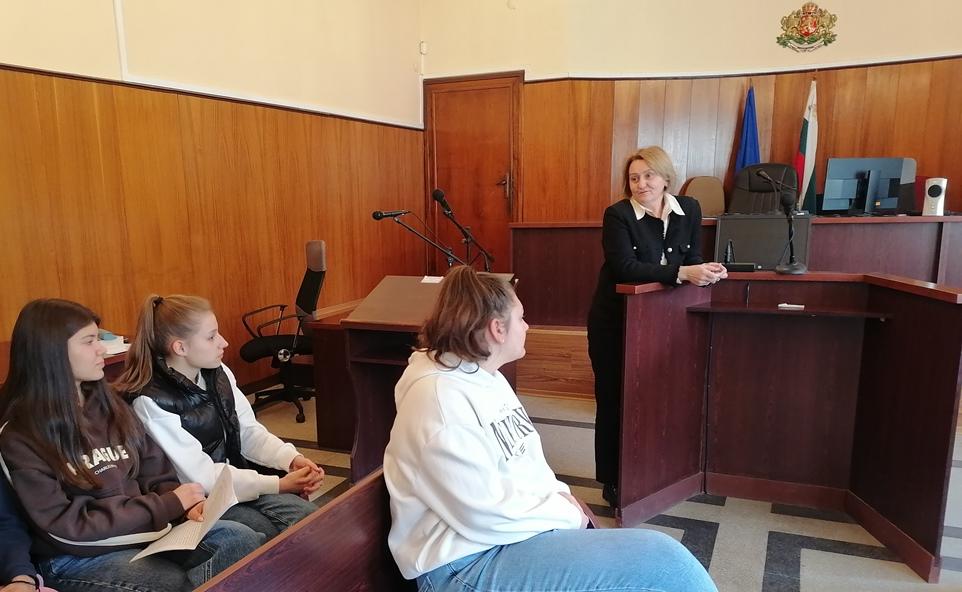 Гостите бяха приветствани от Петя Вълчева - зам.-председател на Окръжен съд – Враца. Срещата се проведе в съдебна зала № 1, като в началото г-жа Петя Вълчева, която е наказателен съдия, изнесе кратка беседа за разделението на властите в България, за видовете дела, които се разглеждат в съдилищата и запозна учениците с местата в залата на участниците в съдебните процеси. За първи път, в рамките на инициативата, учениците направиха дебат по предварително подготвен наказателен казус за умишлено убийство на дядо от внука му – престъпление по чл. 115 от Наказателния кодекс.