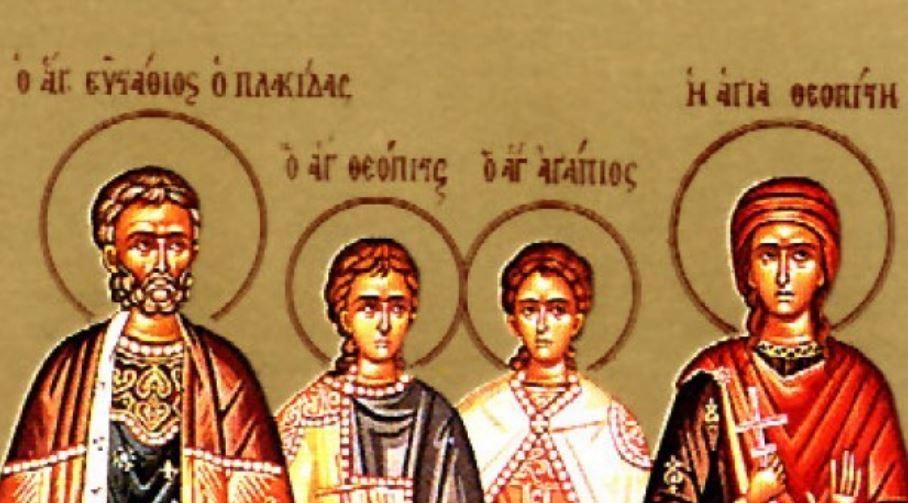 Като езичник Евстатий носел името Плакида. Бил прославен римски пълководец при царуването на императорите Тит и Траян. Той приел свето Кръщение заедно с жена си Теопистия и синовете си Агапий и Теопист. Прекарвал живота си в благополучие. Скоро обаче се заредили и изпитания.
