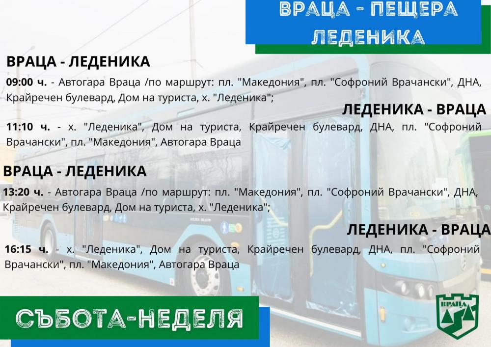 Курсовете по маршрут Враца - Леденика ще се извършват в 09:00 и в 13:20 часа. В обратна посока, превозните средства ще извозват пътници в 11:10 и в 16:15 часа.
