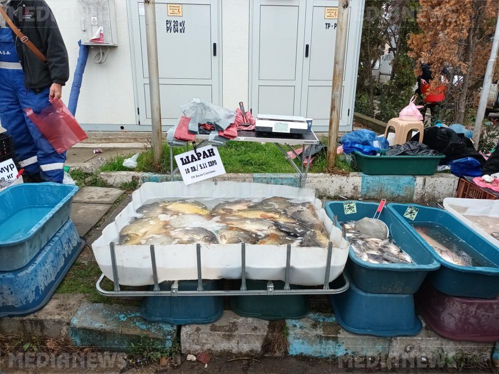 Изборът на жертвен шаран бе голям и затрудняваше купувачите. В коритата подскачаха стотици риби, които сякаш се опитваха да избегнат съдбата си.