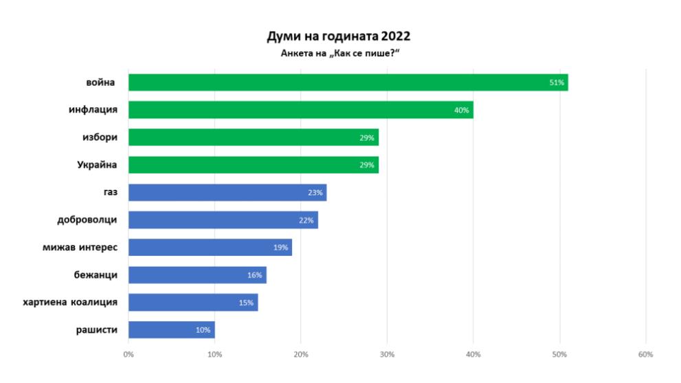Първенецът „война“ има 51%, следва „инфлация“ с 40 на сто гласували, а на трето място с по 29% са „избори“ и „Украйна“. Интересна е съпоставката с въпросите, които вълнуваха хората през предходната 2021-ва. Тогава на първите три места в анкетата се наредиха некнижовното „преценям“, „антиваксър“ и „изчегъртване“.