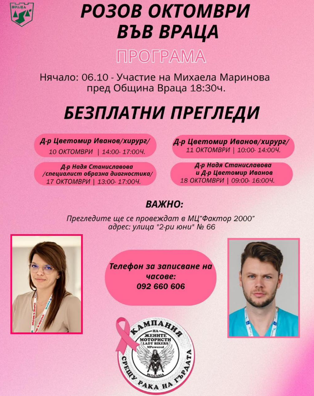 Прегледите ще се извършват в МЦ „Фактор 2000“, ул. „2-ри юни“ № 66