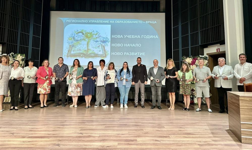 На сцената Колева поздрави и трима от пенсионираните учители от Враца – Антоанета Сиракова, Снежанка Каменова и Виктор Кръстев – и им връчи плакет от името на РУО – Враца.