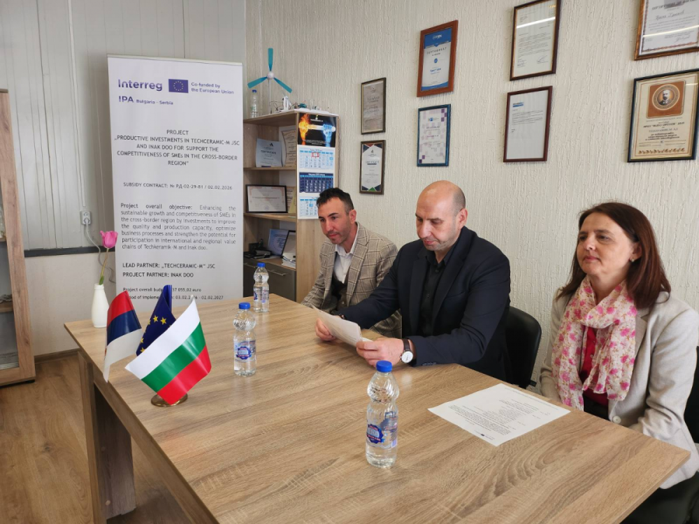 Ръководителя на проекта Г-н Костадин Костадинов запозна присъстващите с основните цели, дейности и очаквани резултати от изпълнението на проекта. Общата цел на проекта е насочена към подобряване на устойчивия растеж и конкурентоспособността на малките и средни предприятия (МСП) в трансграничния регион, чрез инвестиции за подобряване на качеството и производствения капацитет, оптимизиране на бизнес процесите и засилване на потенциала за участие в международни и регионални вериги за създаване на стойност на Техкерамик-М и Инак Доо.
