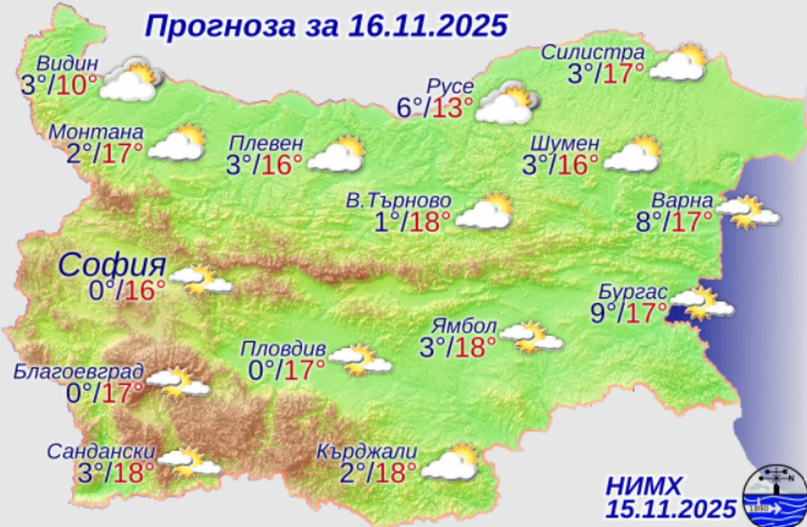 Минималните температури ще бъдат между 0° и 5°, а максималните - между 14° и 19°, по-ниски в местата с трайна мъгла - между 10° и 13°. В София минималната температури ще е около 0°, максималната – около 16°.