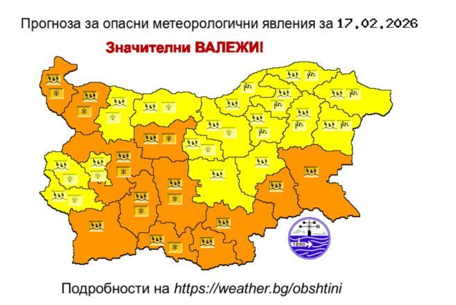В планините ще бъде облачно със снеговалежи. Дъжд ще вали в Странджа и Сакар. На места валежите ще са значителни по количество. Ще духа силен вятър от южната четвърт, който привечер ще започне да се ориентира от север-северозапад и да се усилва. Максималната температура на височина 1200 метра ще бъде около 2°, на 2000 метра – около минус 2°.