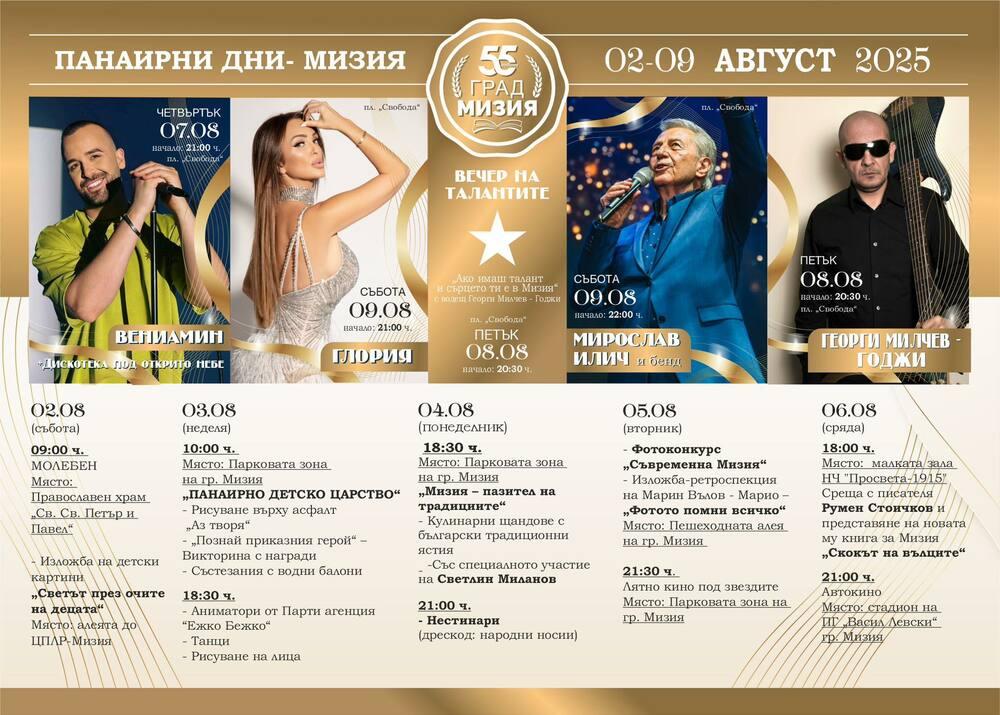 В петък е предвидена вечер на талантите под надслов „Ако имаш талант и сърцето ти е в Мизия“, с водещ Георги Милчев – Годжи.