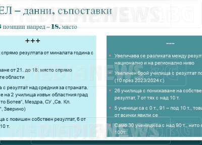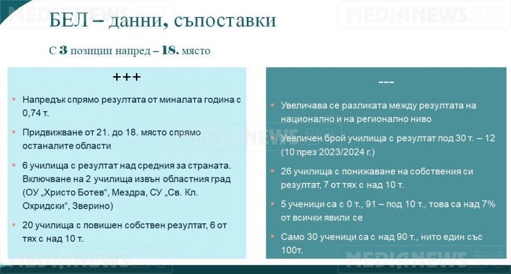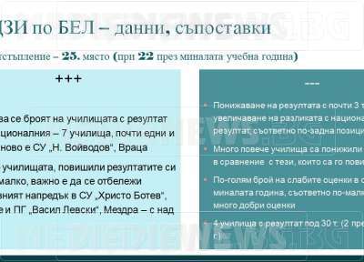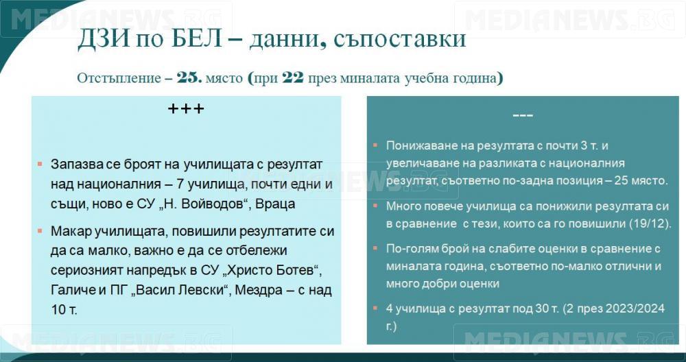 При ДЗИ сериозен напредък се забелязва в две училища - ПГ „Васил Левски“ - Мездра и СУ „Христо Ботев“, Галиче, въпреки отстъплението с 3 места,