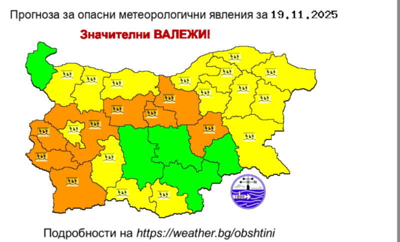 През следващото денонощие времето в страната ще се задържи облачно с валежи от дъжд, значителни по количество на места в Югозападна, Централна Северна и Североизточна България, както и в южните райони на Източните Родопи.