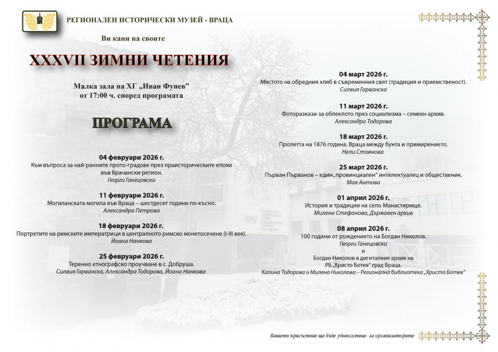 В рамките на 37-то издание на традиционните Зимни четения ще бъдат представени 10 доклада. Откриването е на 4 февруари, от 17 часа, в малката зала на Художествена галерия "Иван Фунев" във Враца.