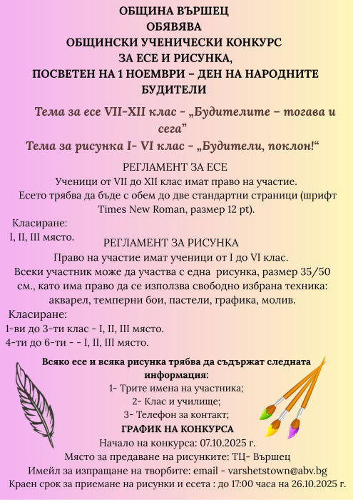 Конкурсът започва на 7 октомври 2025 г., а крайният срок за предаване на творбите е 26 октомври до 17:00 ч. Творбите могат да се изпратят по имейл на varshetstown@abv.bg или да се предадат лично в Туристическия център във Вършец.
