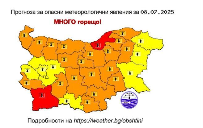 Освен за Русе и Благоевград оранжев код е обявен за - Видин, Монтана, Враца, Плевен, Ловеч, Габрово, Велико Търново, Търговище, Разград, Шумен, Силистра, Кюстендил, Пазарджик, Пловдив, Стара Загора, Кърджали, Хасково, Сливен, Ямбол.