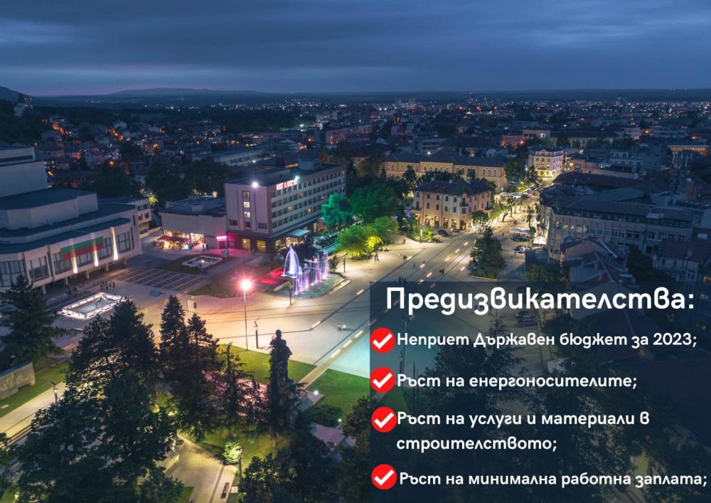 Прогнозните разчети на бюджетните разходи през 2023 година са в размер на над 109 млн. лв. „Поради липсата на приет Държавен бюджет, приходите и разходите на общините трябва да са обвързани с направените през същия период на предходната година. Въпреки това, имаме подготвени конкретни предложения, които ще бъдат реализирани в рамките на мандата.