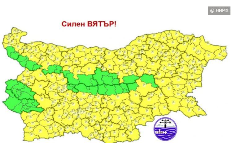 Почти за цялата страна е обявен жълт код — този път не заради очаквани валежи от дъжд, а заради силен вятър. Зелен код е в сила за областите Перник, Кюстендил, Монтана, Пловдив, Габрово, Велико Търново и Сливен.